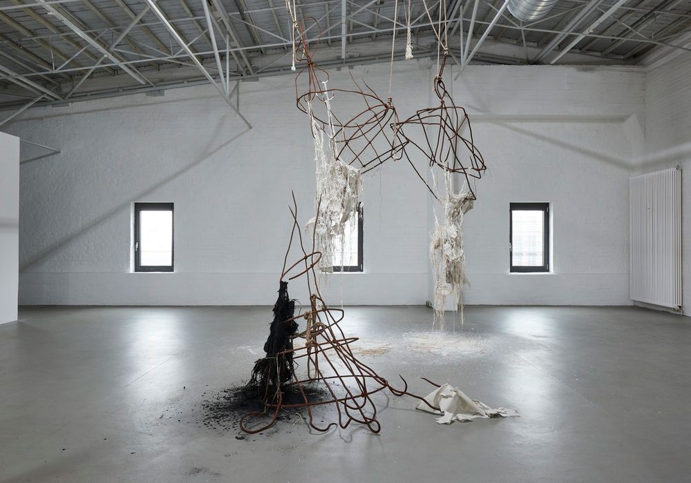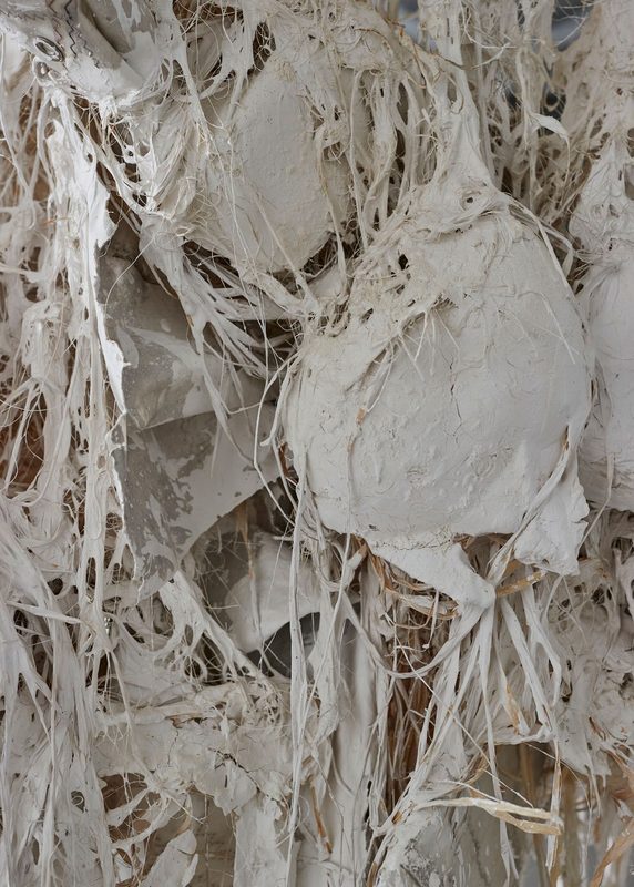 White’s seemingly fragile works are imbued with an immediately palpable brutality. In her visual vocabulary, White combines the imitation of a shipwreck with destroyed sails, dilapidated hand-woven nets, ropes and tattered buoys wrapped in a ghostly kaolin shroud. Harpoons, which appear decomposed by salt water, are also recurring elements in her work.