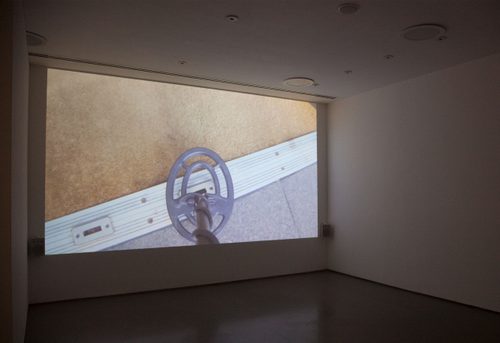 No sooner had I formulated the thought, the chair starts rocking back and forth. It reminds me of a seat in the back of a row of wooden chairs in the 2010 work Cinema by Signer that was shown at the Swiss Institute in New York. The chair then starts to rise against the backdrop of the crenelated façade, higher and higher, until it is turned upside down like a giddy child on a playground swing with nothing above it but sky. It hovers in the air, briefly, to then rise again, gently swaying, lingering awhile, until it seems time to descend – which it does in stages.