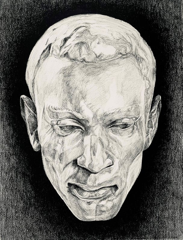 This is a clue. So is the light, which seems to come from nowhere. Vision isn’t durable or to be trusted. Appearance in this series is conditional, induced. Fortnum’s way of posing the problem of looking and what looking wants frees the face to a more fluid state of purpose in that the eyes point back to the hand that is at work. When, among the drawings, the head of Wallace’s father bursts from material darkness like a newborn or anomaly, his eyes are empty of self-knowledge. Fortnum is working economically with history and memory while intervening in the number of subjectivities that can flow through one face.