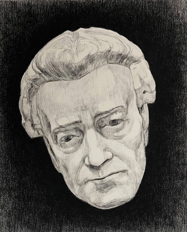 All of the artists whose sculpture Fortnum works from crossed paths with Auguste Rodin (1840-1917) but this is usually one of their lesser anecdotes. The actress and sculptor Sarah Bernhardt (1844-1923), for instance, nursed her dying husband, a failed actor and morphine addict, before carving a funerary bust in marble that Fortnum draws. In faces by Camille Claudel (1864-1943) and Jessie Lipscomb (1861-1952), Fortnum sees the two women’s tricky friendship: Lipscomb as Rodin’s reluctant go-between with Claudel; Claudel renouncing Lipscomb; Lipscomb returning to visit Claudel during her long incarceration in Montdevergues Asylum and asking her husband to photograph them standing side by side.