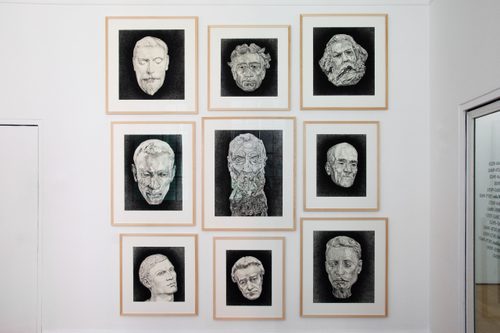 The accompanying drawings, made with dense carbon pencil, are based on portraits of men produced by the women. The images often depict figures close to the artists – partners, teachers, fathers – yet the vast scale of the works makes these encounters confrontational.