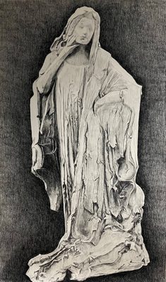 Am I looking for sly facticity or to gain access to a feeling? One drawing that stands out is from a work by Bessie Potter Vonnoh (1872-1955), who met Rodin only once and was allegedly disappointed. Fortnum drew from images of Vonnoh’s maquette of Sarah Bernhardt which is missing a face. The head without one is like a door or mirror in that I see my own desire to look or move. Vonnoh was known for her small bronzes but Fortnum’s drawing is larger than life, sort of like Rodin’s Monument to Balzac 1898 except that Bernhardt seems nonplussed. Expression without appearance. This is one of those moments where I am thinking about reality meaning what is possible. Something else Fortnum told me from Maclaren Wallace’s diaries is that she wanted to be happy but she also wanted to be a good artist.