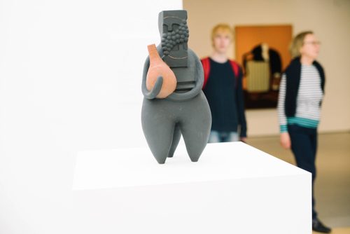 Typically glazed in matt black or made in dull clay and left unglazed, So’s sculptures appear as black stone or metal. Both these and her ‘paintings’ draw heavily upon Neo-Assyrian and Classical sculpture but also primitive pan-cultural pottery and fertility idols. A number of ceramic tile pieces, also included in the exhibition, are inspired by Neo-Assyrian stone carved reliefs and the Ishtar Gate of Babylon. Yet it is the Bellarmine jug that has been So’s most significant influence.