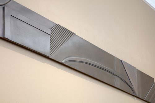 Dalwood collaborated with the architect and town-planner Tom Hancock, an enthusiast of Victorian buildings. As the façade was not solid stone Dalwood thought it would be difficult to achieve a unified design so he proposed a continuous horizontal relief in reflective aluminium.