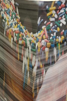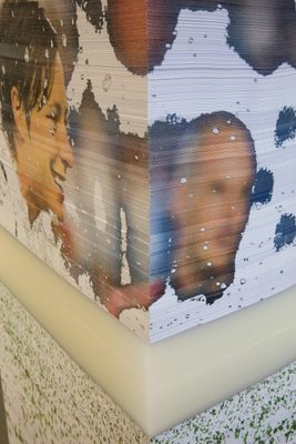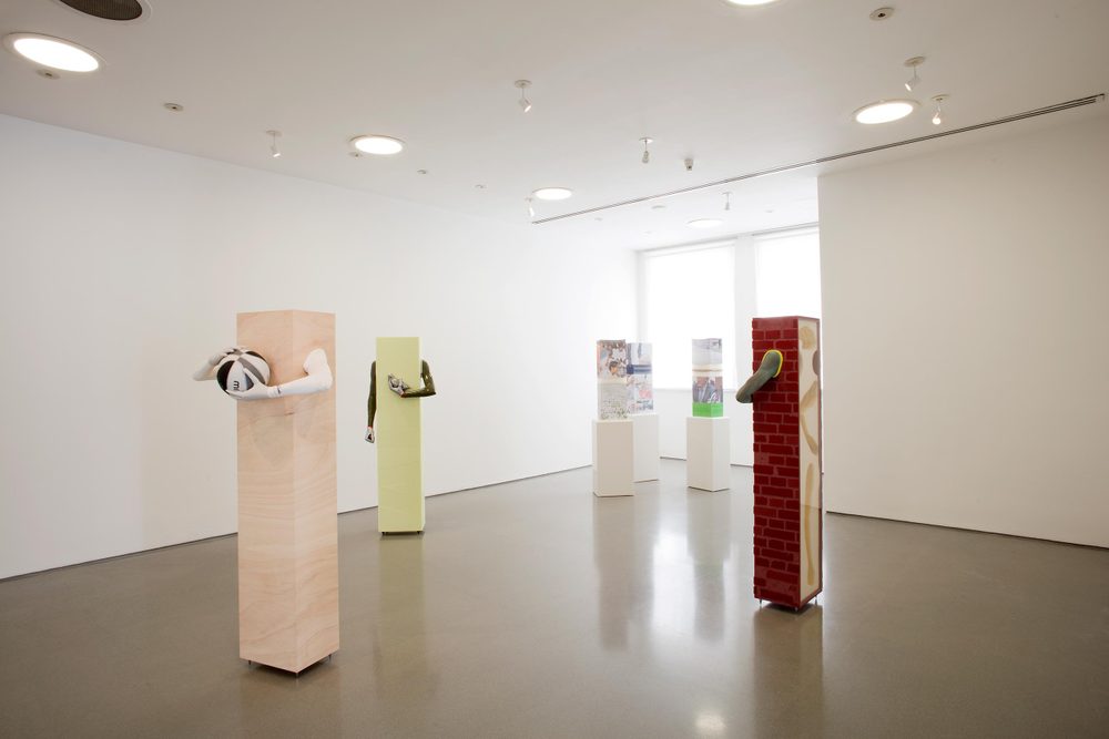 Another three sculptures reimagine the Korai in a sports context. Displayed alongside these six Votives stands a series of monolithic vertical monuments made of over 10,000 sheets of stacked A4 paper. These Paper Stacks address the reproducibility of images on the internet. Images are formed on each side of the sculptures by using the borderless function on an inkjet printer, a machine that less than a decade ago was the height of home-office technology, but now is near obsolete.