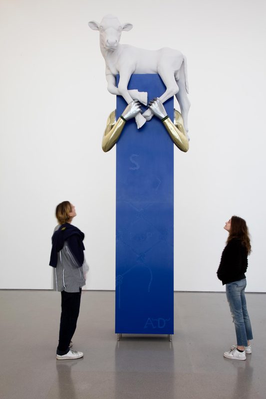 In our central gallery is the monumental votive Calf Bearer 2017. Over four metres tall, it draws on both Domanović’s recent research into molecular biology and the ancient Greek sculpture ‘Moscophoros’ – a statue of a man carrying a sacrificial calf on his shoulders. Presumed to have been built as a votive offering to the goddess Athena, it was found in fragments in the Athens Acropolis.