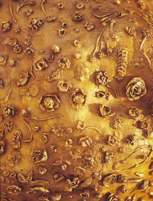 Cast in brass and covered with a tracery of flowers and insects, the sculpture could easily slip into the heavily ornate decoration of the Embassy, but within the confines of Gallery 4 it had a deliberately odd presence. Ballroom (ornament) is in fact too big for an ornament, but it is also too small to be monumental; and although its surface is finely detailed, the work is gaudy, squat and far from beautiful.