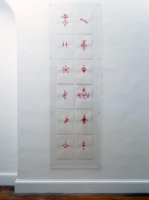 This new work, made especially for the Institute, stems from 1995 when Cooke attended a function in the ballroom of the Irish Embassy in London. The ornate gilded stucco she saw decorating the walls of the room was later the focus of her drawings in red paint in which modelled details became abstract forms. These drawings eventually led to Ballroom (ornament).