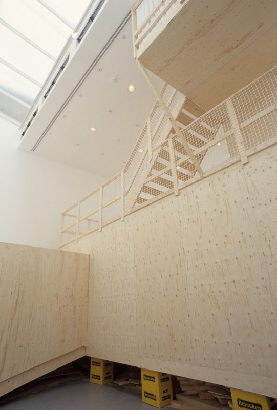 Inside the high-ceilinged space of Gallery 2, van Lieshout fabricated an ambitious construction: a three storey structure consisting of interlocking modules, fashioned from timber and industrial materials. Accessed by a tunnel, these three eminently habitable spaces each serve a different function; social or private, passive or active. Together they create an institution with an institution; visitors have access to books and videos from the Institute’s library, and spaces in which to relax and reflect on how van Lieshout’s work reveals and subverts the architecture of the gallery.