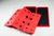 The box contains a folded sheet of red paper burned by a heated stainless steel cone to create holes of diminishing dimensions when the sheet is open.
