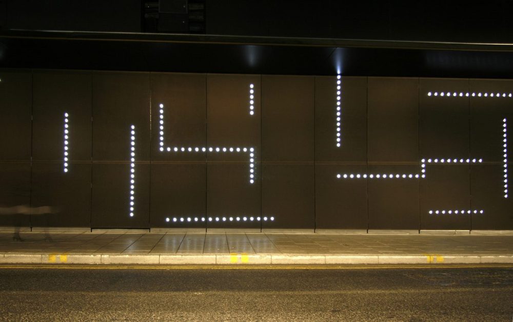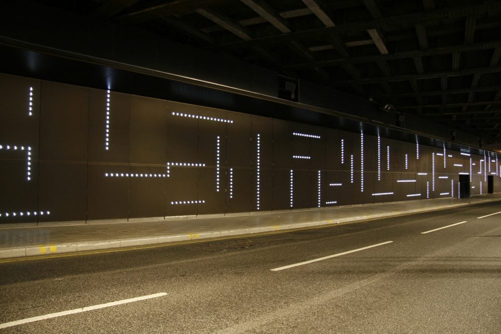 A Light and Sound Transit was the work of internationally renowned artist Hans Peter Kuhn, made for the East Wall of the tunnel. Computer controlled and comprised of 3200 LED lights that spanned the length of the tunnel, it would generate a new abstract artwork of light each day.
