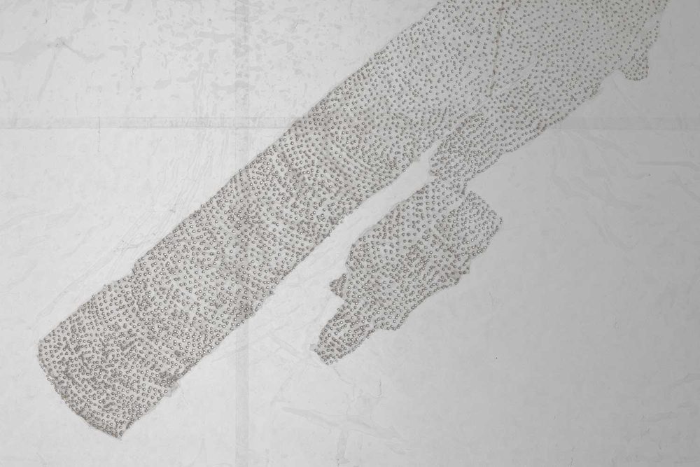 Emergency! What Was Is are long translucent drawings made with waxed paper. They are 5.5 metres long and hang from near the ceiling, cascading to the floor where the paper is crumpled up. The material looks a bit like ice. The surface is pierced through with tiny pin-pricks, creating outline image fragments of glacial archaeology. The pin-pricks let light into the room.