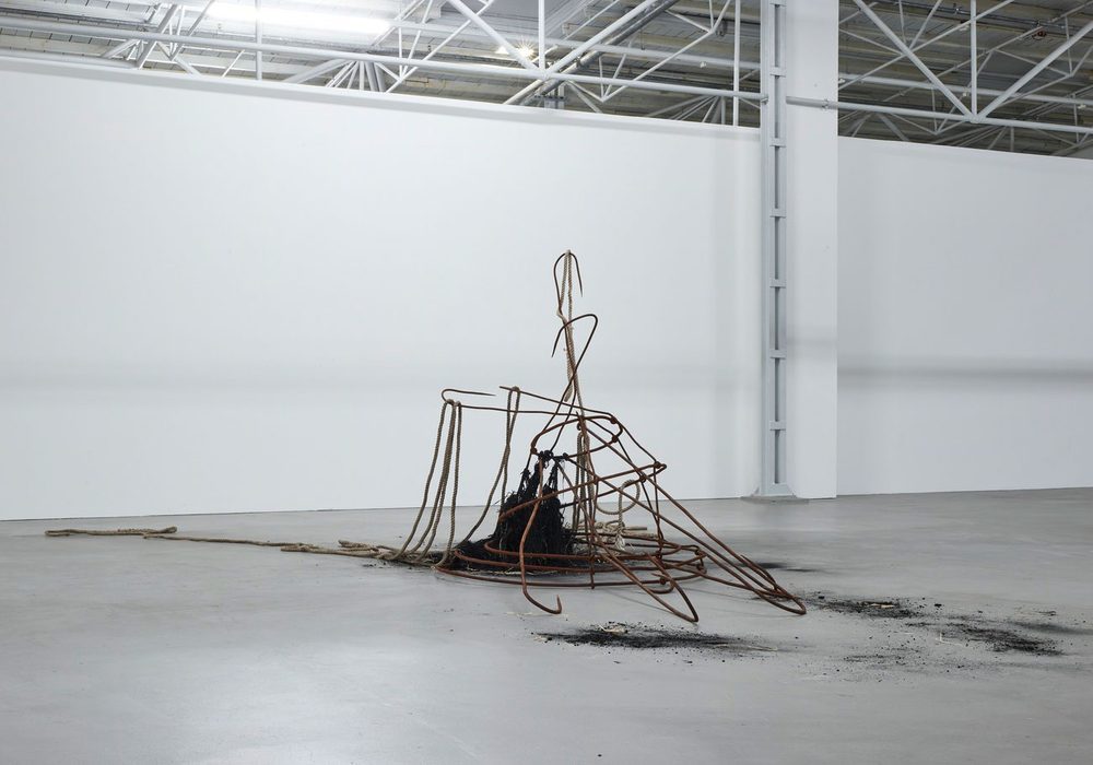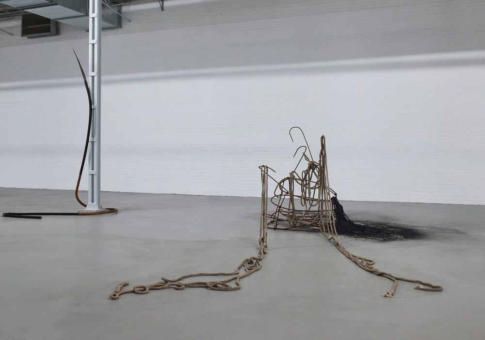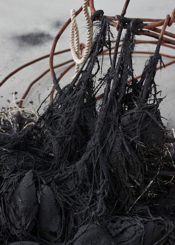 White’s seemingly fragile works are imbued with an immediately palpable brutality. In her visual vocabulary, White combines the imitation of a shipwreck with destroyed sails, dilapidated hand-woven nets, ropes and tattered buoys wrapped in a ghostly kaolin shroud. Harpoons, which appear decomposed by salt water, are also recurring elements in her work.