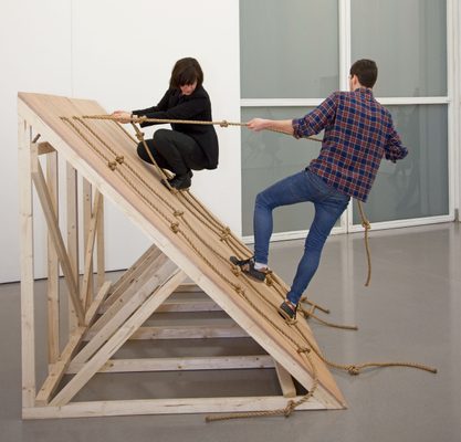 The rules of each game are clearly defined in the instructions set out in the individual ‘dance constructions.’ The very name Slant Board suggests a (board) game, as do the twisted, lightly waxed linen ropes, knotted at regular intervals for the performers to hold on to as they move across and up and down the inclined platform recalling an adventure playground. A series of sketches dating to 2010, Slant Board Drawings with Rope, vividly renders the gestures of tugging and pulling at the rope.