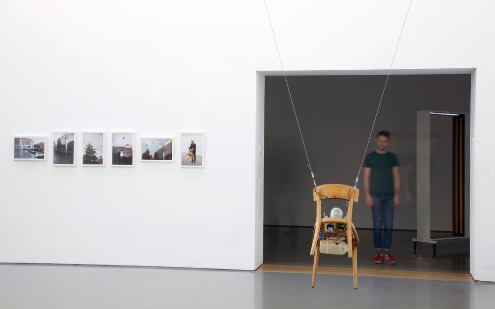 No sooner had I formulated the thought, the chair starts rocking back and forth. It reminds me of a seat in the back of a row of wooden chairs in the 2010 work Cinema by Signer that was shown at the Swiss Institute in New York. The chair then starts to rise against the backdrop of the crenelated façade, higher and higher, until it is turned upside down like a giddy child on a playground swing with nothing above it but sky. It hovers in the air, briefly, to then rise again, gently swaying, lingering awhile, until it seems time to descend – which it does in stages.