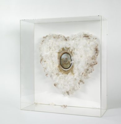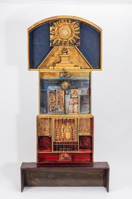 This work, titled Ex Voto-Schrein III, was made by Eva Wipf who was born in 1929 in Santo Ângelo do Paraiso, Brazil, to a family of Swiss missionaries. They returned to Switzerland when she was five. Her work often protests the patriarchal structures of the church and state, using found objects sourced from flea markets and antique shops to construct assemblages such as Ex Voto-Schrein III.