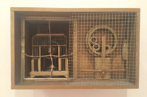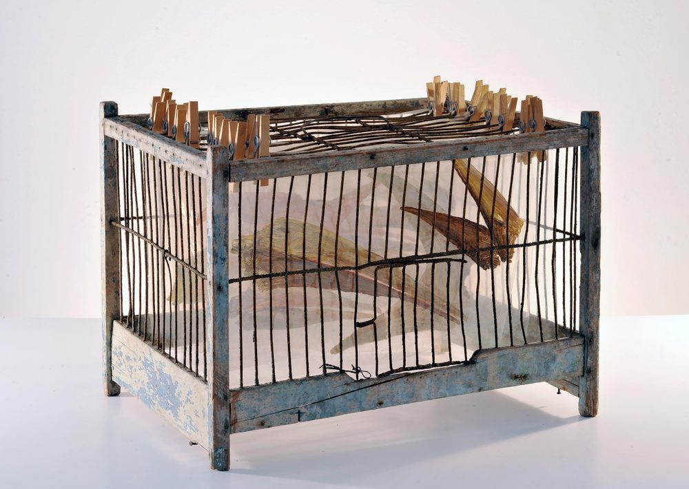 Eva Wipf’s shrine-like assemblages incorporate found and flea market objects like wooden boxes, birdcages, mousetraps, soap dishes and barbed wire.