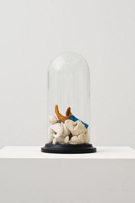 While the squirrel’s tail is presented, the rest of the body is absent, leaving you with only the tail, which functions as the handle. The absence of the squirrel’s body adds to the abstraction. It’s displayed opposite a sculpture of a black dog across the gallery space, as if the dog is about to pounce on the squirrel’s tail. Yet, the overall effect is more cutesy than violent, despite the cracked glass and the real squirrel’s tail.