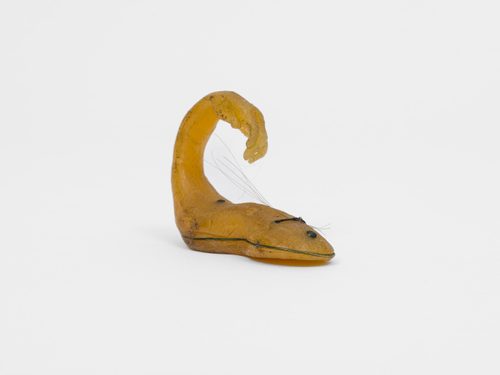 It’s an eerie piece, with delicate strands of the artist’s own hair running through it, almost threatening to break upon touch. There’s a hint of violence in its form, as though it’s about to strike or act. The insect-like shape gives the piece an unsettling feeling, making it feel alive, or on the brink of action.