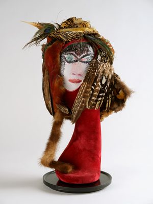 This piece evokes a feeling of carnivalesque extravagance – almost like a Venetian masked ball. The exaggerated features and animal-like fur suggest something ceremonial, a trophy perhaps, as though this figure is both art and an offering of sorts. It looks like a huntsman or a mythical character.