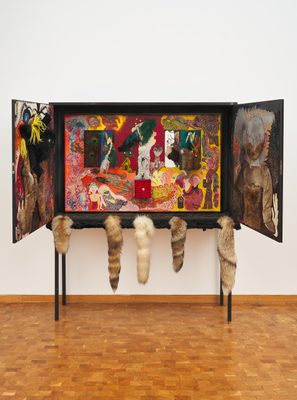 This work is titled Pandora’s Large Cabinet and it was made in 1966 by the artist known as Ursula, who was born in Brandenburg, Germany, in 1921. Ursula’s work was often powerfully sensual and intense. It encompassed painting, drawing, collage, assemblage and installation, and she exhibited regularly in international galleries and museums until her death in Cologne in 1999.