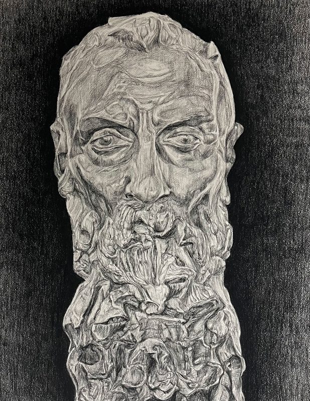 All of the artists whose sculpture Fortnum works from crossed paths with Auguste Rodin (1840-1917) but this is usually one of their lesser anecdotes. The actress and sculptor Sarah Bernhardt (1844-1923), for instance, nursed her dying husband, a failed actor and morphine addict, before carving a funerary bust in marble that Fortnum draws. In faces by Camille Claudel (1864-1943) and Jessie Lipscomb (1861-1952), Fortnum sees the two women’s tricky friendship: Lipscomb as Rodin’s reluctant go-between with Claudel; Claudel renouncing Lipscomb; Lipscomb returning to visit Claudel during her long incarceration in Montdevergues Asylum and asking her husband to photograph them standing side by side.