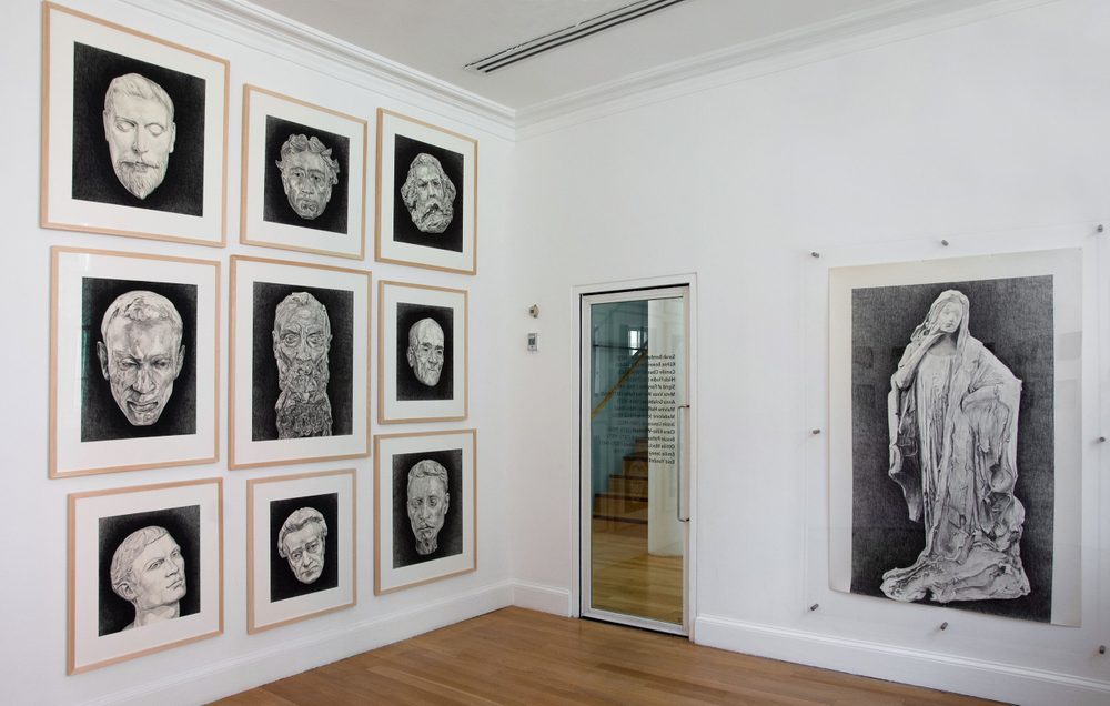 The accompanying drawings, made with dense carbon pencil, are based on portraits of men produced by the women. The images often depict figures close to the artists – partners, teachers, fathers – yet the vast scale of the works makes these encounters confrontational.