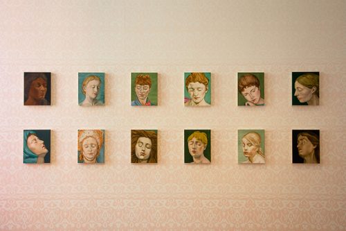 Fortnum’s paintings are based on portraits of women sculpted by women. They are displayed on specially designed, hand-printed wallpaper that, working against the averted or downward gaze of the sitters in the paintings, draws the viewer into its ornamentation and symmetry.