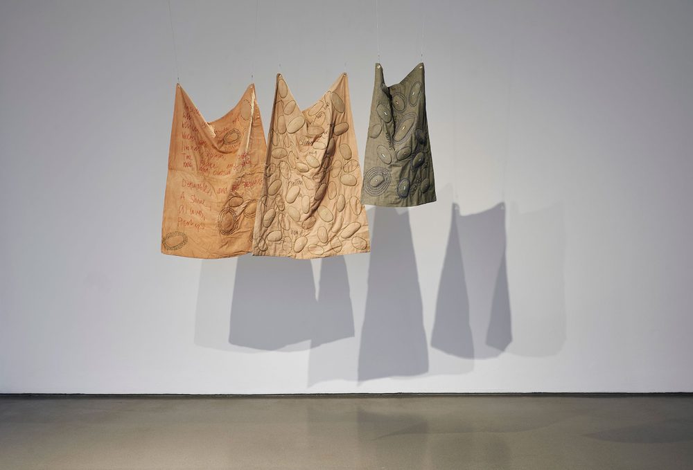 Veronica Ryan introduces the work on display in Portable Sculpture, discusses making work on the move, the use of embroidery in her pillow case pieces and the inspiration behind them.