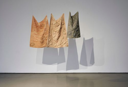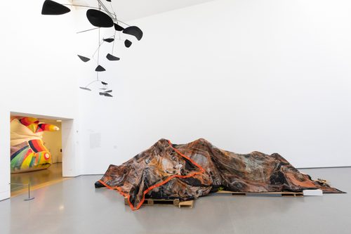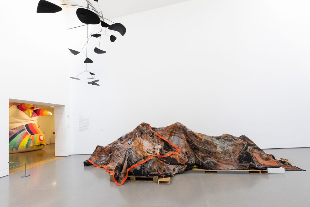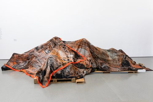 Liz Ensz’s work consists of large-scale silkscreen prints of images from Google Earth showing the impact of human activity, which are arranged on top of piles of ‘the best local trash’ to create provisional landscapes. Ensz originally created specially designed structures for the silkscreened fabric to drape over, but found that these vastly increased the costs and complexities of exhibiting the work.