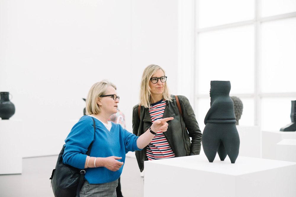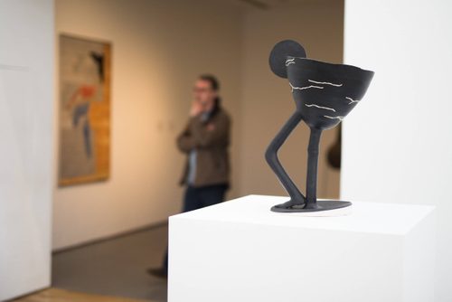 Typically glazed in matt black or made in dull clay and left unglazed, So’s sculptures appear as black stone or metal. Both these and her ‘paintings’ draw heavily upon Neo-Assyrian and Classical sculpture but also primitive pan-cultural pottery and fertility idols. A number of ceramic tile pieces, also included in the exhibition, are inspired by Neo-Assyrian stone carved reliefs and the Ishtar Gate of Babylon. Yet it is the Bellarmine jug that has been So’s most significant influence.