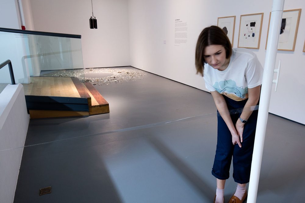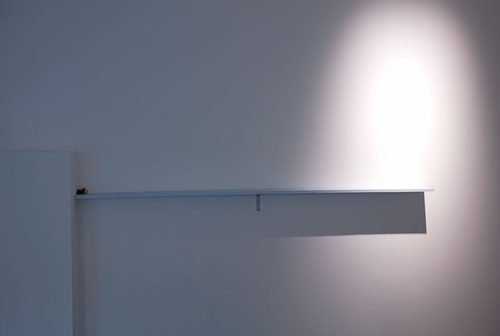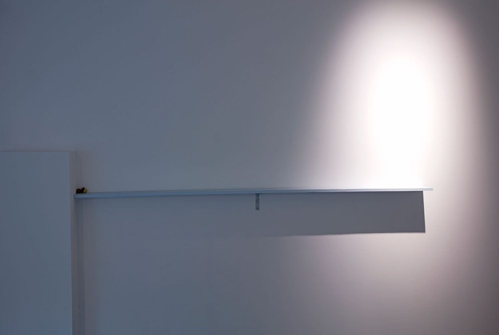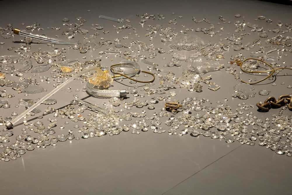 Displayed in Leeds for the first time in fifteen years, the floor-based installation Black 1994 is composed from a shattered chandelier whose fragments are directed by a theatrical lamp suspended from the ceiling. The lamp is turned on just once to establish a circle that will remain empty, with the broken pieces clustered densely around the perimeter of the absent light and gradually spreading further apart as they reach the boundaries of the gallery. Attentive to the possibilities of making everyday objects strange, Nogueira often deployed fragmentary elements that resonate with fragility and menace.