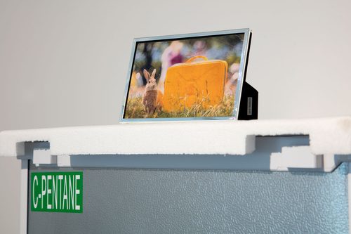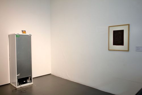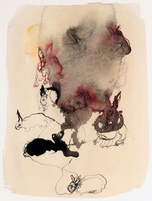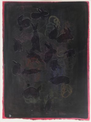 The exhibition also includes four further sculptures, made during the mid-1990s, embodying the delicacy and danger inherent in materials of everyday life. Otherwise benign consumables such as a domestic fridge freezer take on more disturbing connotations when presented facing the wall and titled Hide and Seek, perhaps evoking the world of childhood warnings against becoming trapped and suffocating in discarded refrigerators. Stranger still, the framed postcard of a rabbit holding a suitcase that sits on top of the fridge freezer – an animal to which Nogueira frequently returned in her drawings.