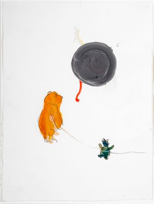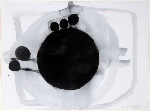 Dating from 1989 to 1992 the selection of works on paper represents a fraction of a prolific body of work in ink and watercolour. Made on a flat surface in her London studio, these painted drawings are sometimes sparse and sometimes so densely populated that the ground is almost completely obliterated. Moving between inscrutable abstractions and recognisable representations of quotidian objects and popular fictional characters, they extend our understanding of her sculptural concerns while operating as resolved works of art in their own right.