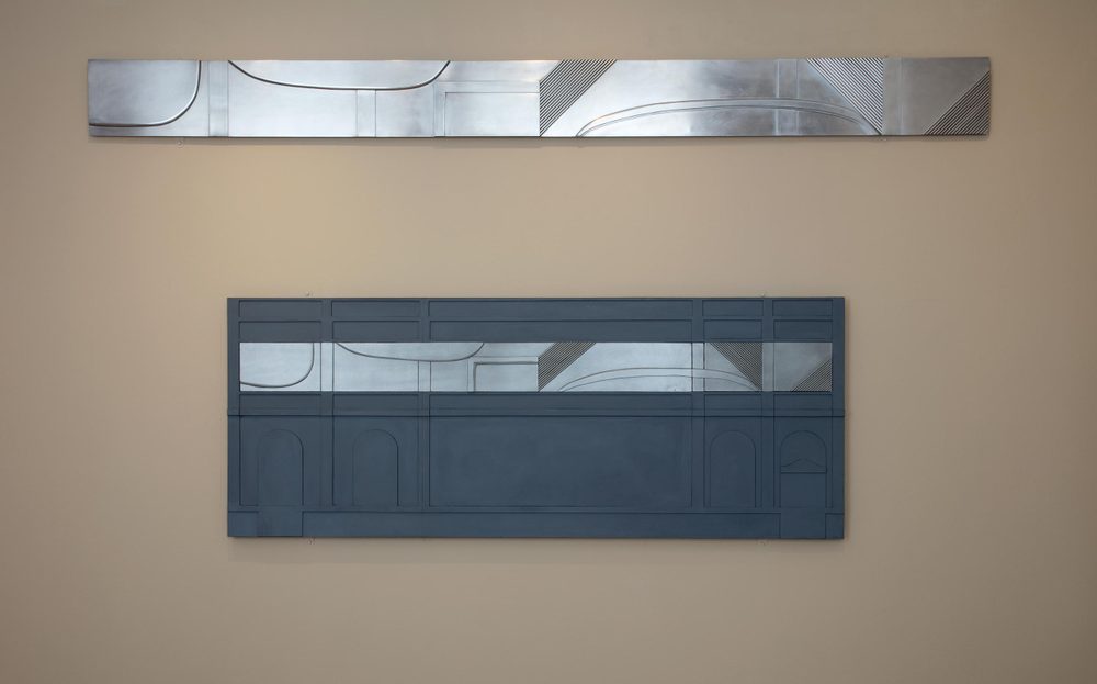 Dalwood collaborated with the architect and town-planner Tom Hancock, an enthusiast of Victorian buildings. As the façade was not solid stone Dalwood thought it would be difficult to achieve a unified design so he proposed a continuous horizontal relief in reflective aluminium.