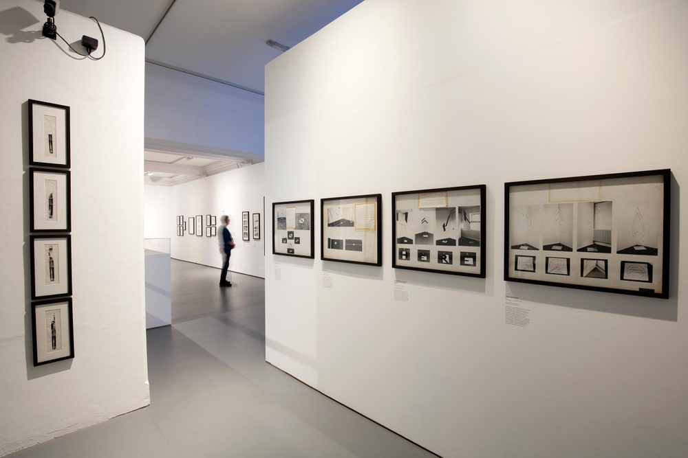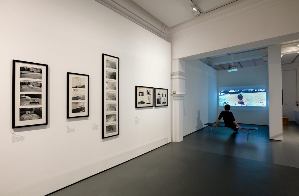 Early drawings for sculptures, photographs of sculptures reproduced in film-like sequences, and presentation boards demonstrate Dye’s consistent exploration into relationships between artwork and spectator. His sculpture Distancing Device 1970 coordinates the movements of the viewer, while films such as Mirror Films 1972, Towards/Away from 1972 and Blind Spot 1973 control the eye with careful precision.