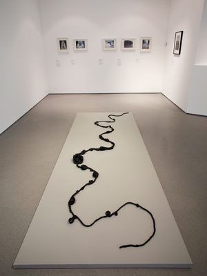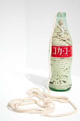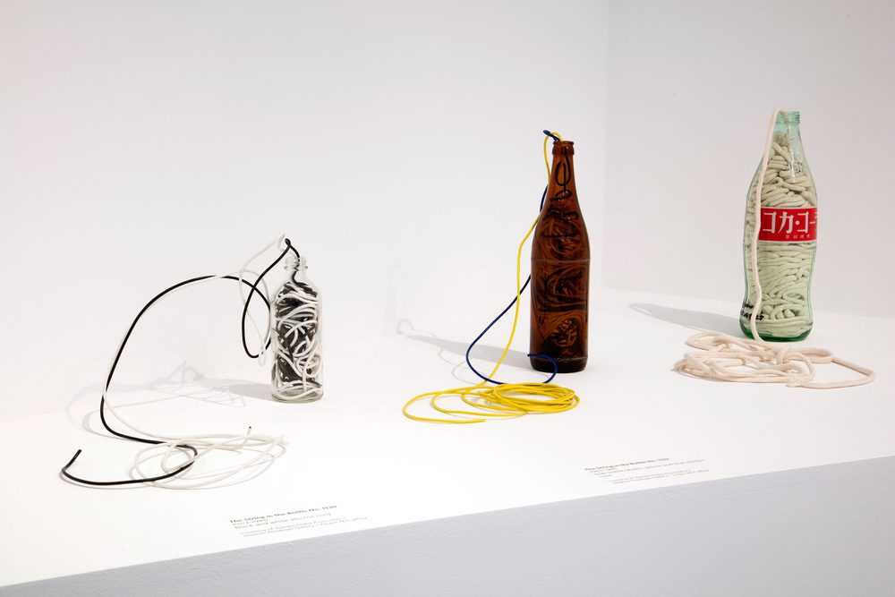 In 1962 he made The Yamanote Line Incident, in which he packed the three-and-a-half kilometre long sculpture String into a checked travel bag and let this long, lumpy rope snake from the privacy of his bag onto the platforms and carriages of the looping Yamanote Line, a central Tokyo commuter route. This expansion of string was contrasted by work in which he would contract it into the confined spaces of fizzy-pop and beer bottles.