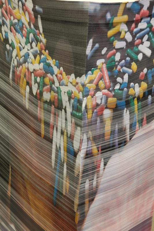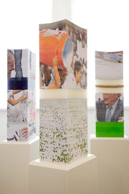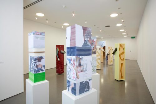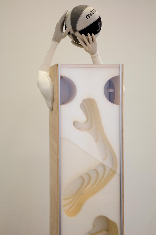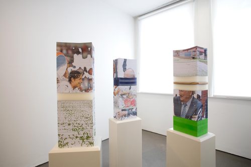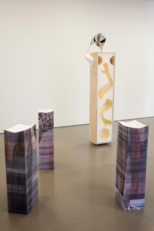 Another three sculptures reimagine the Korai in a sports context. Displayed alongside these six Votives stands a series of monolithic vertical monuments made of over 10,000 sheets of stacked A4 paper. These Paper Stacks address the reproducibility of images on the internet. Images are formed on each side of the sculptures by using the borderless function on an inkjet printer, a machine that less than a decade ago was the height of home-office technology, but now is near obsolete.