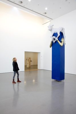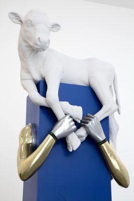 In our central gallery is the monumental votive Calf Bearer 2017. Over four metres tall, it draws on both Domanović’s recent research into molecular biology and the ancient Greek sculpture ‘Moscophoros’ – a statue of a man carrying a sacrificial calf on his shoulders. Presumed to have been built as a votive offering to the goddess Athena, it was found in fragments in the Athens Acropolis.