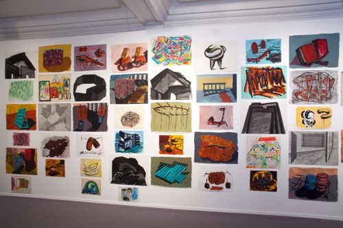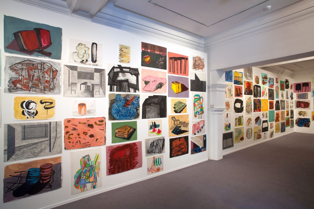 Describing them as ‘bad copies’, Barlow’s drawings are often derived from her environment, but never drawn from life; they range from swift biro and pencil sketches in notebooks and diaries, often appearing beside domestic reminders and lists, to more heavily worked acrylic drawings and oil paintings, which experiment with surface textures as well as colours, forms and arrangements.