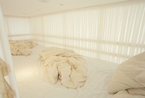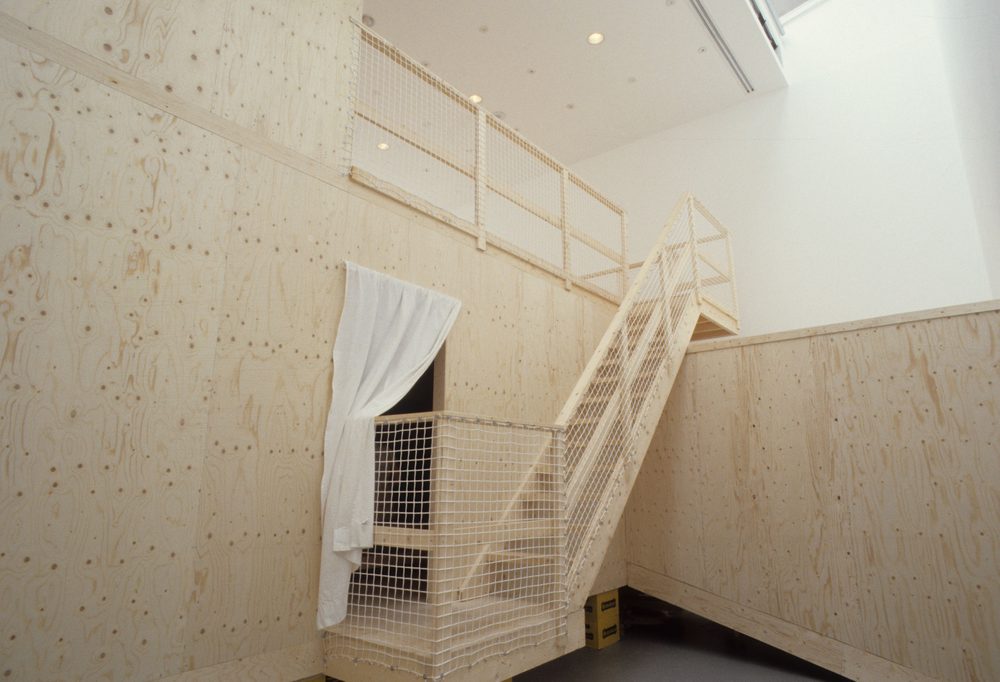 Inside the high-ceilinged space of Gallery 2, van Lieshout fabricated an ambitious construction: a three storey structure consisting of interlocking modules, fashioned from timber and industrial materials. Accessed by a tunnel, these three eminently habitable spaces each serve a different function; social or private, passive or active. Together they create an institution with an institution; visitors have access to books and videos from the Institute’s library, and spaces in which to relax and reflect on how van Lieshout’s work reveals and subverts the architecture of the gallery.