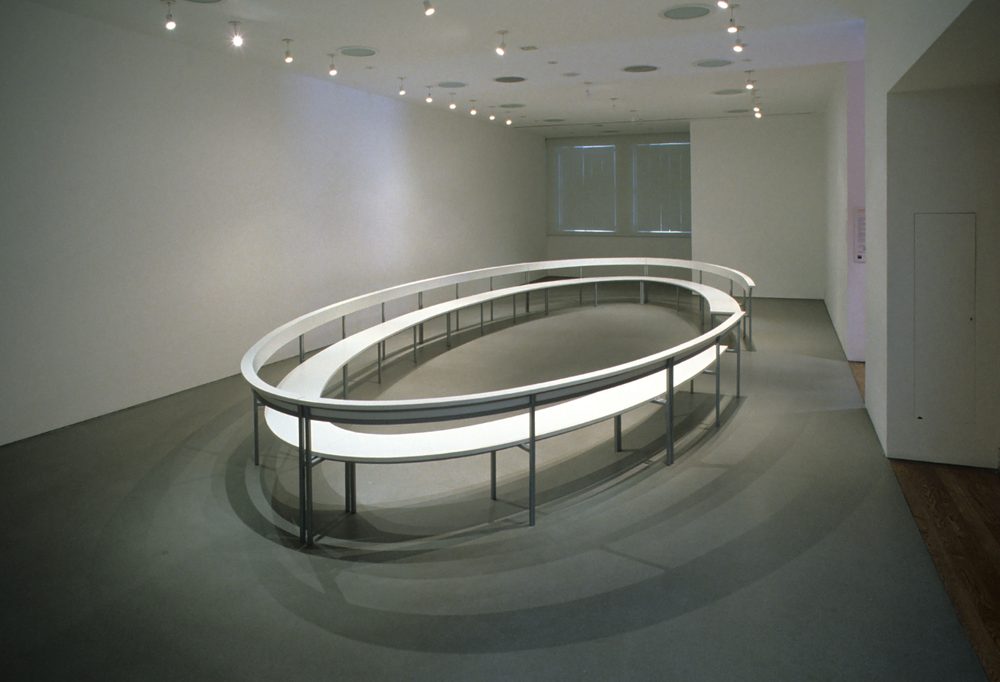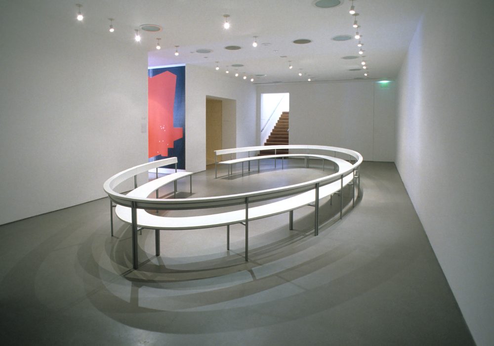 Langlands & Bell’s project provides a public space for the talks and symposia normally held elsewhere in the building, while simultaneously providing an opportunity to reflect on how the structures we all use or inhabit can either enhance or inhibit the way we exchange information and ideas. Taking the form of an elliptical structure that refers to the formal architecture of auditoria, its flexible structure allowed for multiple interpretations and relationships between audience and participant.