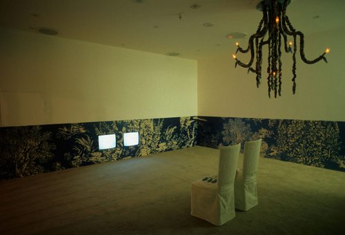 The very private, subconscious world evident in Françoise Quardon‘s work is a comment on the Institute as a space for reflection and contemplation. Quardon’s space is dark and textured, animated both by language and by highly ornate domestic furnishings which are larger than life. Words suggest that memory and loss can be heard, and relate to the title of the work, ‘The Day Before I Die’. Drawing on the words of William Faulkner in The Wild Palms, this subterranean dreamworld encourages visitors to turn in on themselves and let the imagination take over.