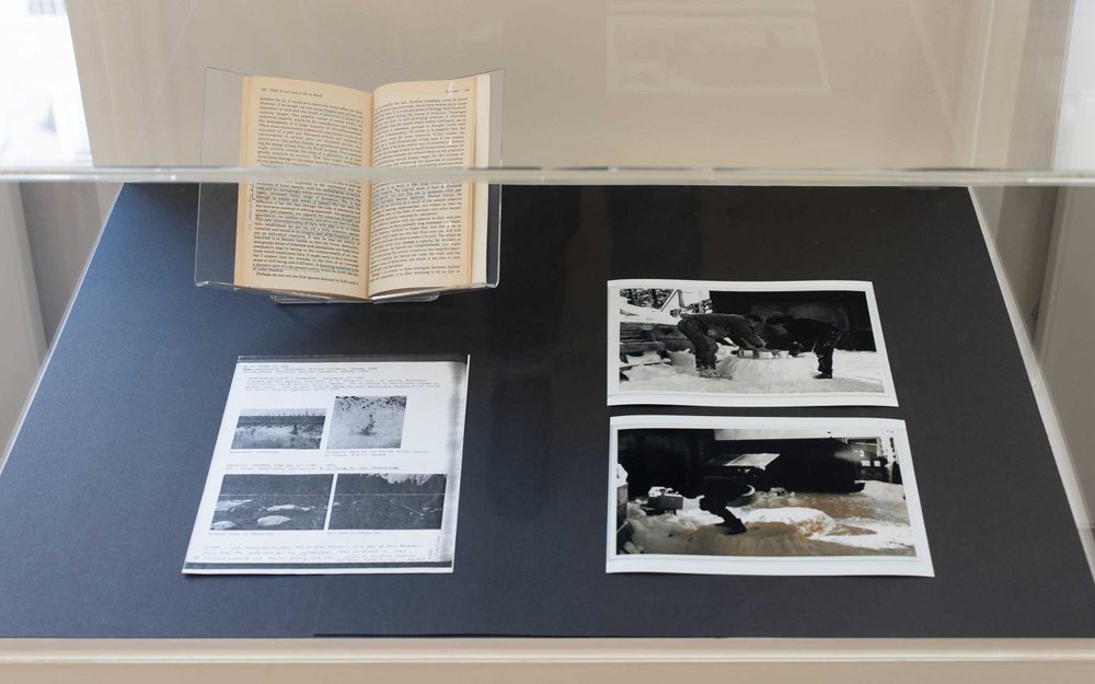 Fragile ice sculptures contingent on the warmth of the morning sun, snow forms melted by urine, and works incorporating domestic dust and the residue of fire are explored through archival material.