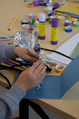 A school group sat around four tables, working on a creative project involving photos of sculpture, transparent sheeting and brightly coloured string.
