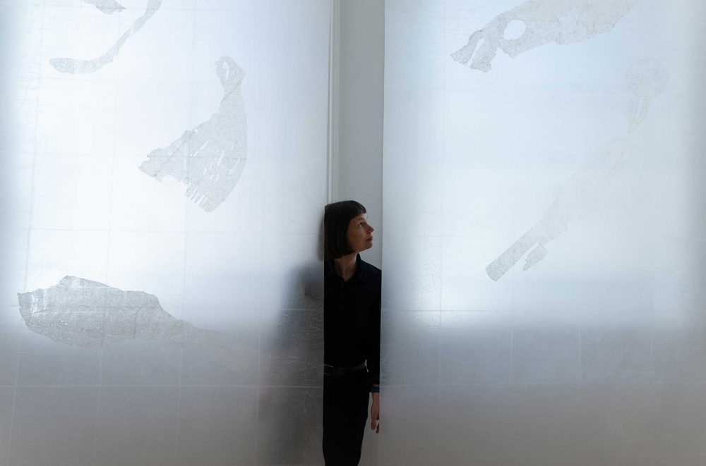 Emergency! What Was Is are long translucent drawings made with waxed paper. They are 5.5 metres long and hang from near the ceiling, cascading to the floor where the paper is crumpled up. The material looks a bit like ice. The surface is pierced through with tiny pin-pricks, creating outline image fragments of glacial archaeology. The pin-pricks let light into the room.