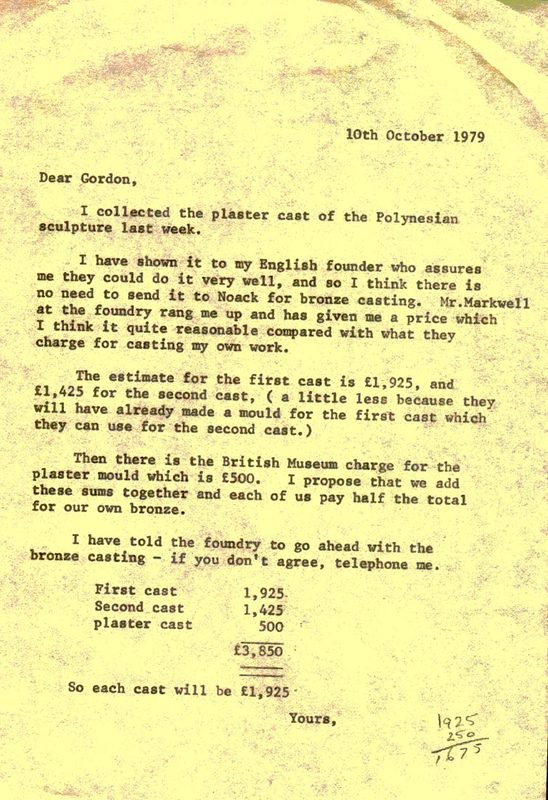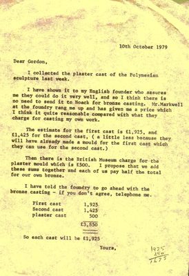 The British Museum agreed that for the cost of £500 plaster casts of A’a would be made available to Moore, who then arranged for them to be sent to the Morris Singer Foundry in Basingstoke. The foundry reassured Moore that it would be simple enough to produce two bronze casts. Moore agreed to split the costs of the casting with Bunshaft and oversaw the shipping of the second cast to his friend in New York in 1980. In 1985 the British Museum made an additional cast which was sent back to the people of Rurutu, where it is now on display.