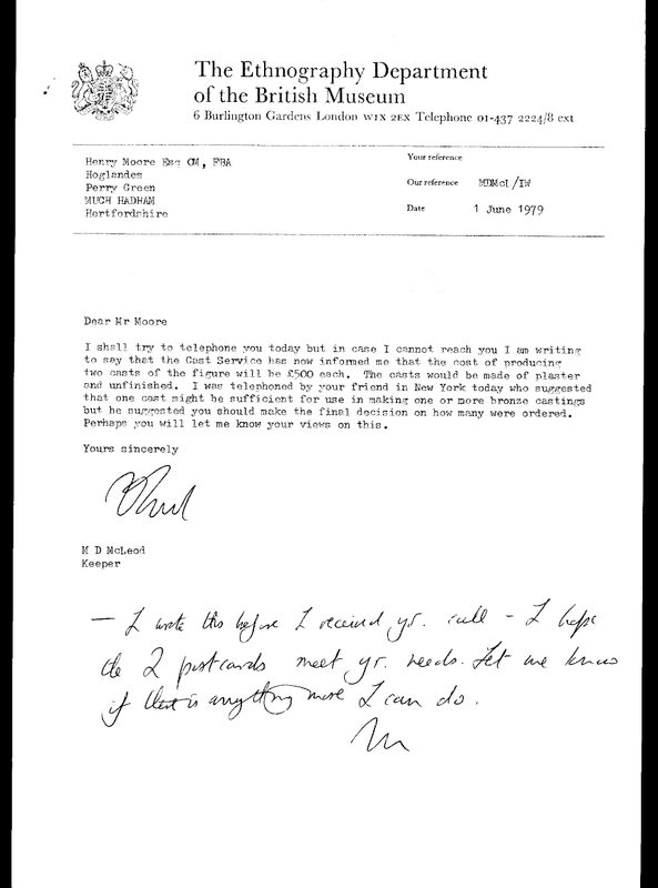In 2016, the Archive team was contacted by the British Museum who were preparing their exhibition Containing the divine: a sculpture of the Pacific god A’a. The Museum wanted to clarify the sequence of events which led to the creation of the bronze casts. By looking through our Correspondence collection the Archive team managed to find the initial letter from Moore’s friend and fellow collector, the American architect Gordon Bunshaft.
